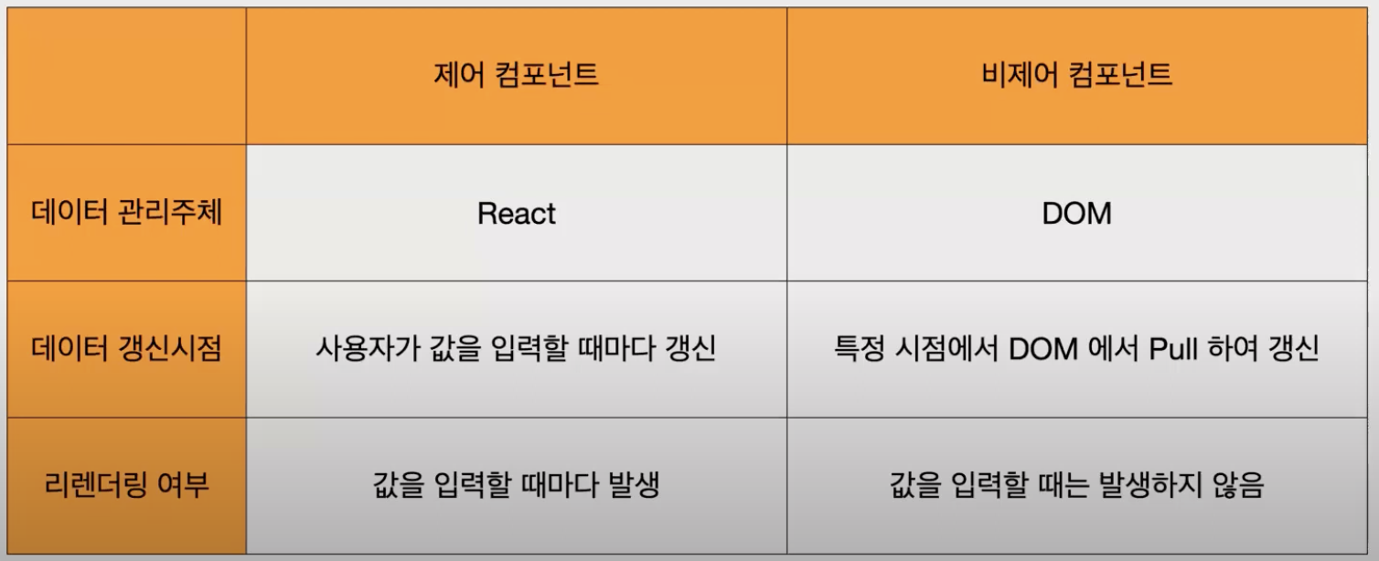 제어 컴포넌트는 리액트 상태를 통해 입력값을 제어하는 컴포넌트이다. 입력 요소의 값을 리액트 상태와 동기화하고, 사용자가 입력을 변경할 때마다 onChange 이벤트 핸들러를 통해 상태를 업데이트한다.