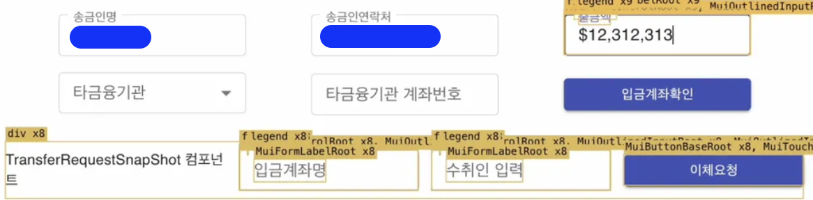하지만 문제는 여전히 남아 있었습니다. TransferRequestSnapShot이라는 컴포넌트 안에서 useWatch()로 출금액을 감시하니까, 결국 그 컴포넌트 전체가 리렌더링되고 있었던 겁니다. useWatch()를 사용하는 컴포넌트 자체가 리렌더링되기 때문입니다.