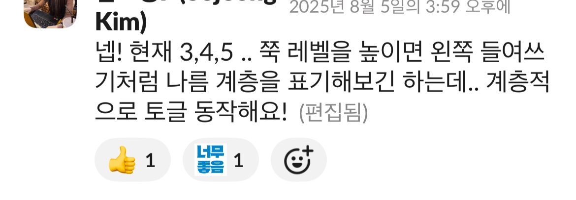 level 필드를 통한 계층 시각화는, 사실상 formType: CollapsibleSection 내부에서 padding을 조정해 아이콘을 표기하는 방식(일종의 트릭)에 불과했다. 섹션 자체가 너비·높이를 갖지 않고, 렌더링 여부 함수에만 의존했기 때문에 구조적으로 깔끔하지 못했다.